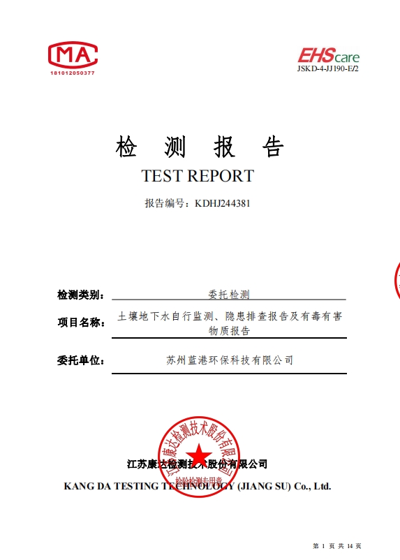 蘇州藍(lán)港環(huán)保科技有限公司檢測報告已公示,詳情請查...